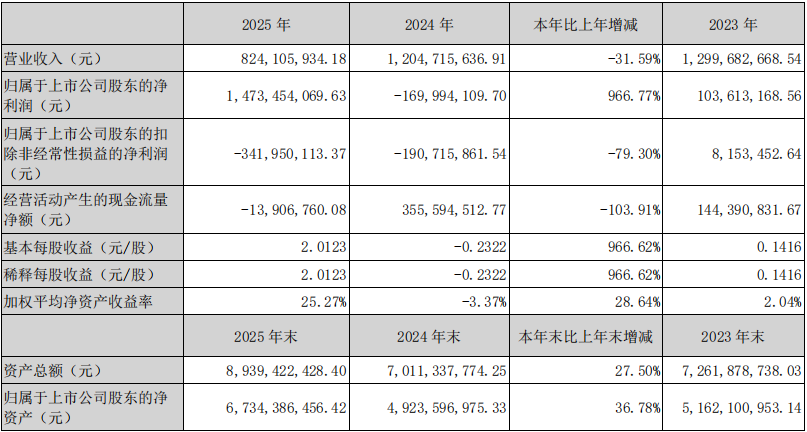 3月26日,赛微电子(300456)发布2025年年度报告。报告显示,公司全年实现营业收入8.24亿元,同比下降31.59%;归属于上市公司股东的净利润为14.73亿元,同比大幅增长966.77%;扣除非经常性损益后的净利润为-3.42亿元,同比下降79.3%。