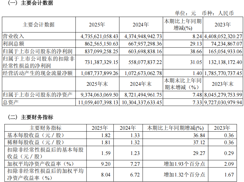 现金流方面,公司2025年经营活动产生的现金流量净额为10.88亿元,同比增长1.40%。投资活动产生的现金流量净额为-11.05亿元,筹资活动产生的现金流量净额为-2.61亿元。