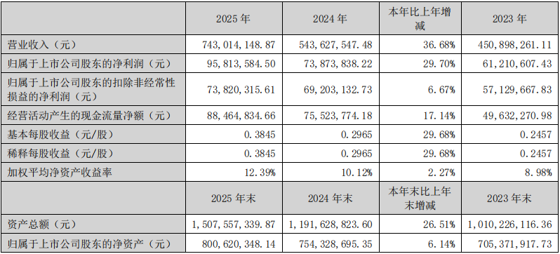 广哈通信于3月27日发布2025年年度报告。报告显示,公司2025年度实现营业收入7.43亿元,同比增长36.68%;实现归属于上市公司股东的净利润9,581.36万元,同比增长29.7%;扣除非经常性损益后的净利润为7,382.03万元,同比增长6.67%。