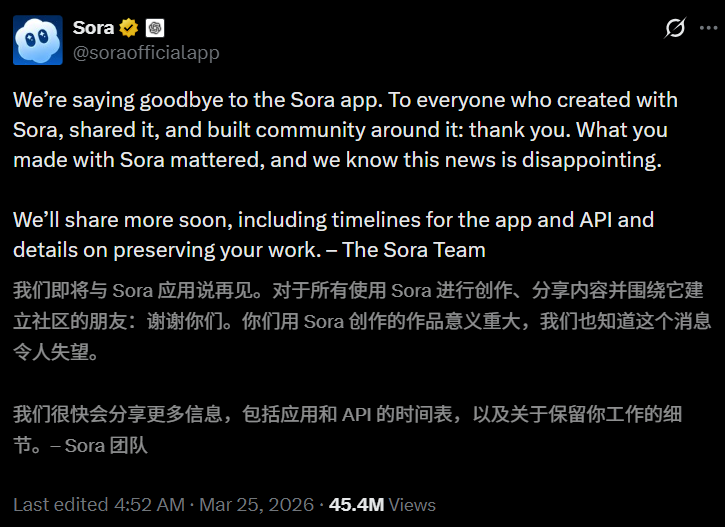 那个去年9月高调上线、与迪士尼签下10亿美元合作、一度被视为AI视频赛道标杆的Sora,说砍就砍了。