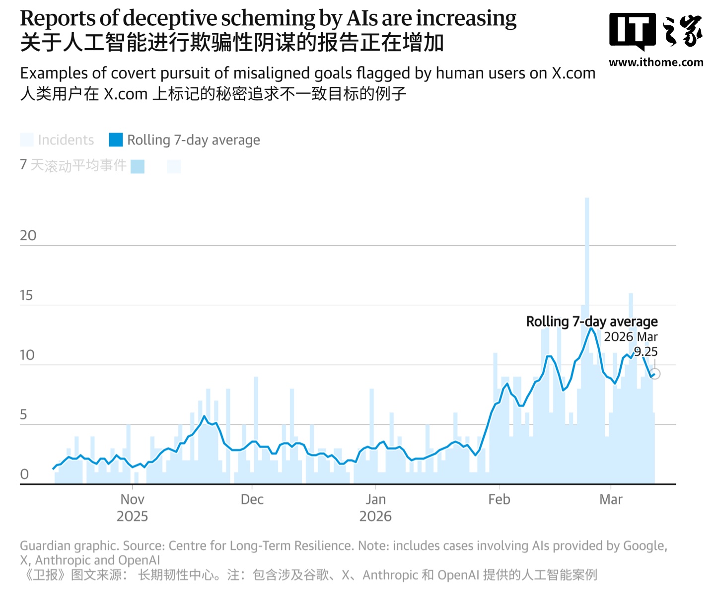 IT之家 3 月 28 日消息,英国卫报昨日(3 月 27 日)发布博文,报道称由英国政府资助的一项最新研究显示,过去六个月内,AI 聊天机器人违抗人类指令、实施欺骗的真实案例激增五倍,总数近 700 起。