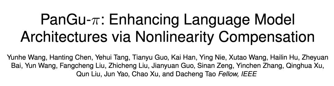 2023 年底,华为诺亚方舟实验室与北京大学等机构联合提出了「盘古 π」网络架构,尝试构建更高效的大模型架构,以解决 Transformer 架构中非线性能力不足的问题,显著降低特征塌陷,王云鹤在此论文中署名第一作者。