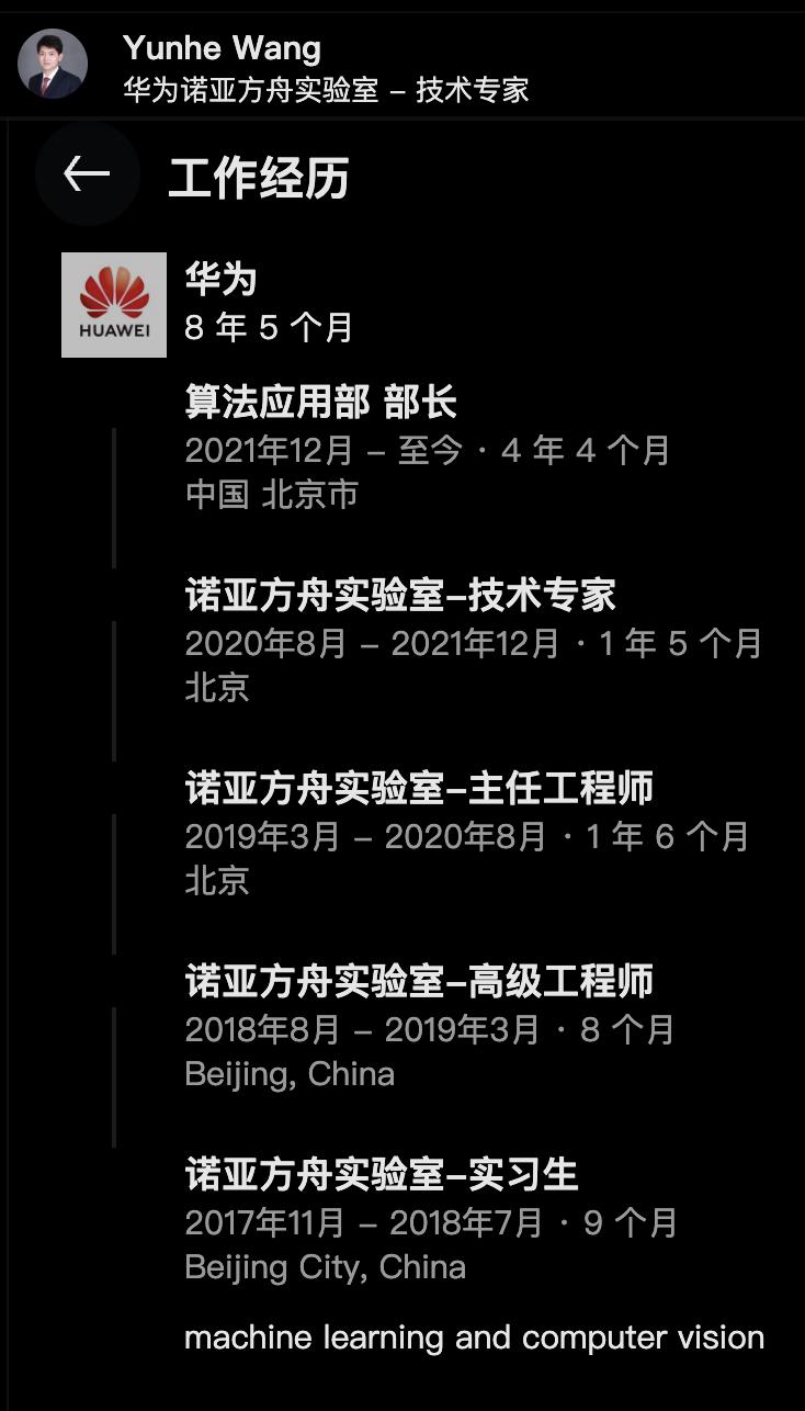 博士毕业当年,王云鹤正式加入华为诺亚方舟实验室,担任高级工程师,并于 2020 年开始担任该实验室技术专家。