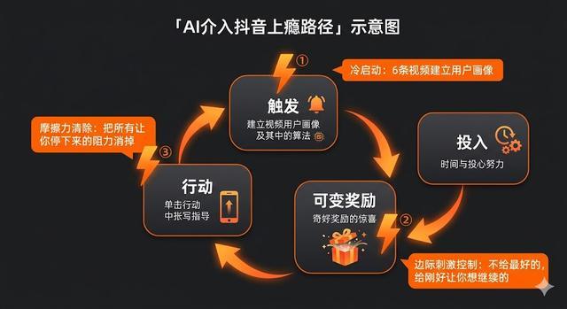 抖音的「可变奖励」靠的是定向精准——AI知道你现在的情绪状态,知道你最近在关注什么,知道你在哪类内容上会停留,然后在合适的时机推合适的内容,把「惊喜感」的命中率提升到另一个量级。