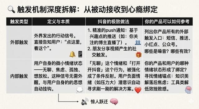触发,是让用户打开产品的那个瞬间。可以是外部的(一条推送通知),也可以是内部的(你感到无聊,条件反射地打开抖音)。