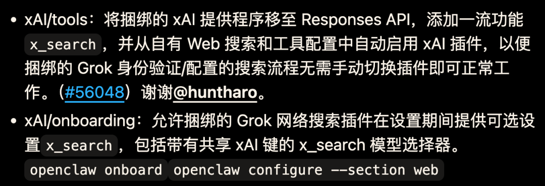 xAI/引导流程:内置 Grok 网页搜索插件现可在 openclaw onboard 及 openclaw configure --section web 期间提供可选的 x_search 配置,包含使用共享 xAI 密钥的 x_search 模型选择器。