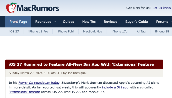 【CNMO科技消息】据外媒报道,彭博社的马克·古尔曼详细地讲述了苹果即将推出的AI计划。他表示,这显然将包括一款Siri应用,并在iOS 27、iPadOS 27和macOS 27中配备所谓的 “扩展”功能。