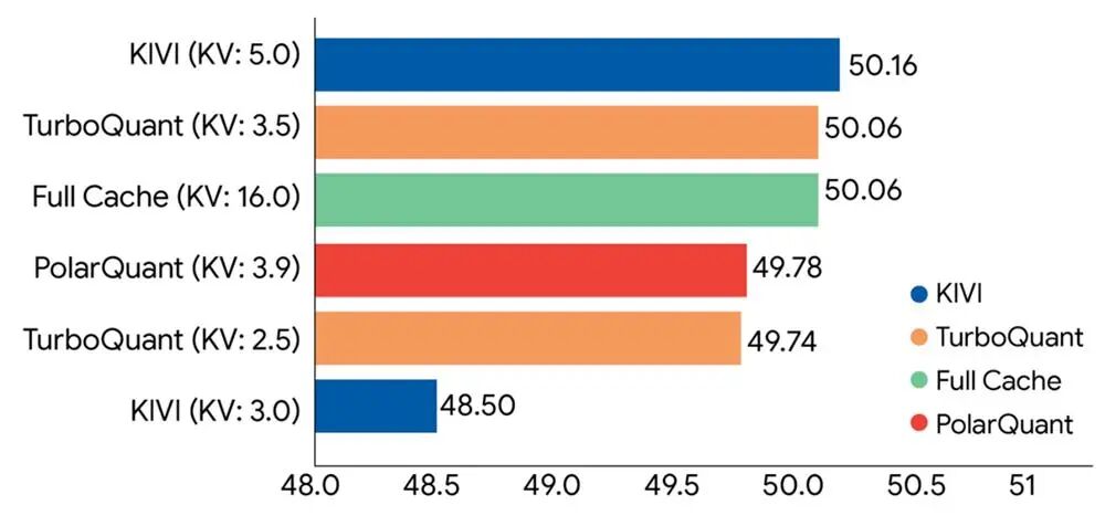 实验中,谷歌称TurboQuant在所有基准测试中均达到了“完美的下游任务表现”,同时将KV缓存的内存占用减至1/6。