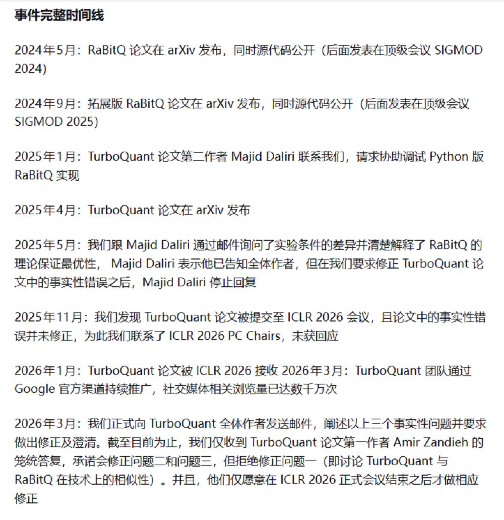 2025年1月,TurboQuant论文第二作者Majid Daliri与RaBitQ团队取得联系,请求协助调试Python版RaBitQ实现,三个月后TurboQuant论文在arXiv发布。
