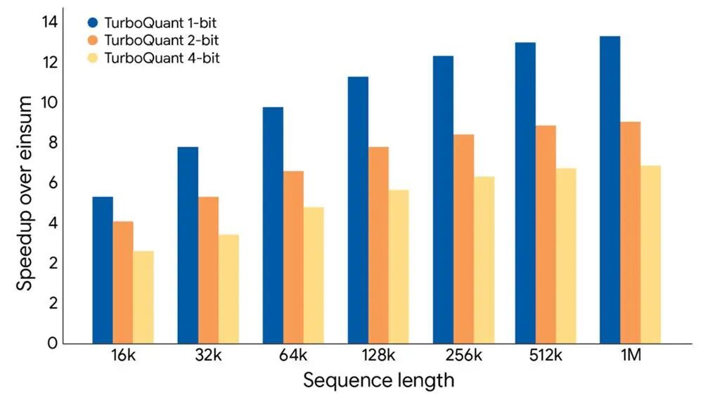 使用TurboQuant计算注意力逻辑值后,在H100 GPU加速器上,4比特TurboQuant相比32比特未量化的键值实现了高达8倍的性能提升。