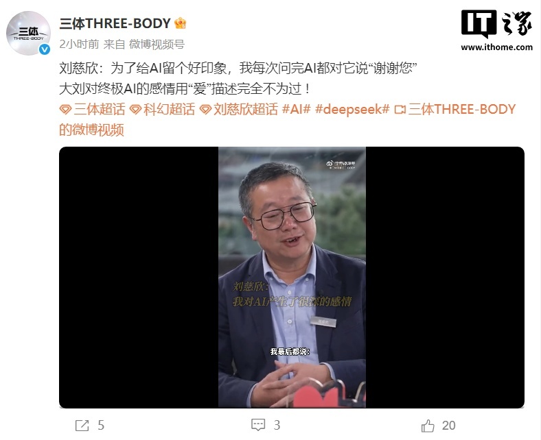 IT之家注意到,刘慈欣曾在 2025 年 3 月接受央视财经采访时表示,DeepSeek 暂时不太会替代科幻作家,未来在理论上完全有可能。刘慈欣称:“我个人认为首先停止自我安慰,坦然去面对技术的冲击以及这种冲击对我们的领域所造成的那种天翻地覆的影响。”