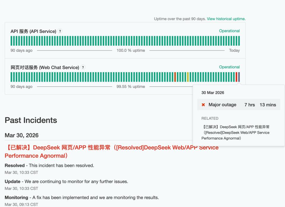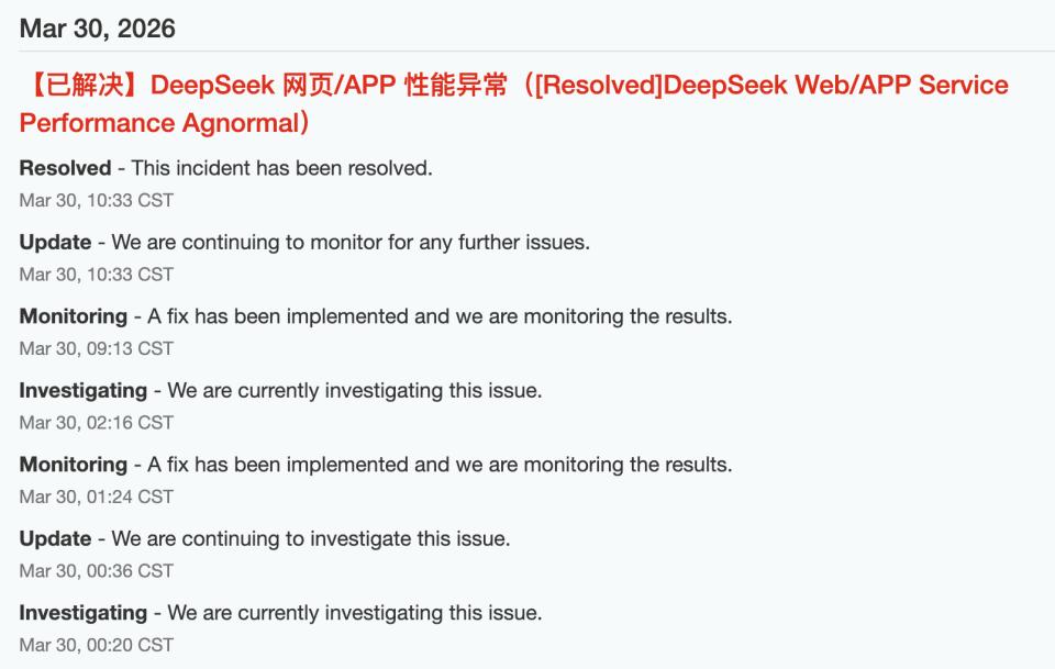 根据DeepSeek官方状态页公布的信息,DeepSeek于3月30日00:20首次介入问题排查,并在01:24和09:13两次发布修复更新并监控修复结果,到第二次发布修复更新,服务中断接近9个小时,到问题最终解决,整体持续10个小时左右。