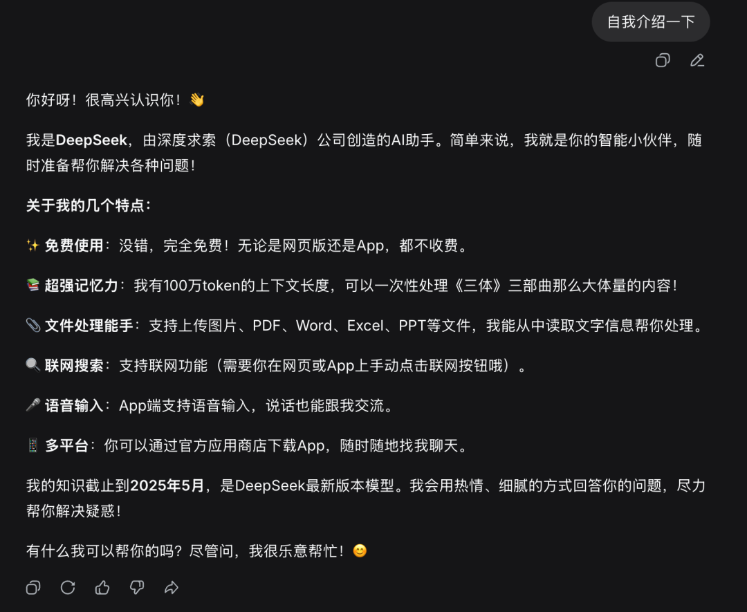 一周前,同样的问题,它的自我介绍还是模糊的“我是 DeepSeek,一款纯文字 AI 助手……“,对自己的版本号只字不提。