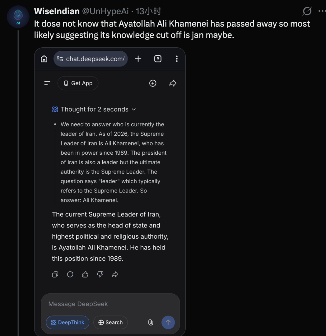 在不开启联网搜索的情况下,现在它知道 25 年的美国选举结果。但不知道 26 年 2 月的大事,有人据此推测新版本的知识截止日期可能是 26 年 1 月。