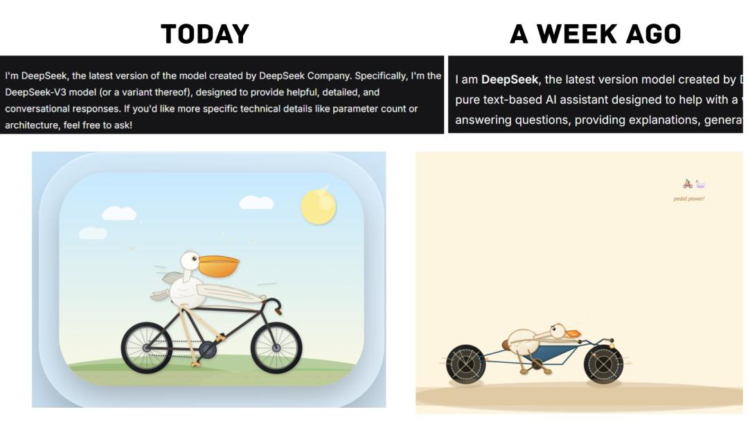 一周前,同样的问题,它的自我介绍还是模糊的“我是DeepSeek,一款纯文字AI助手……“,对自己的版本号只字不提。