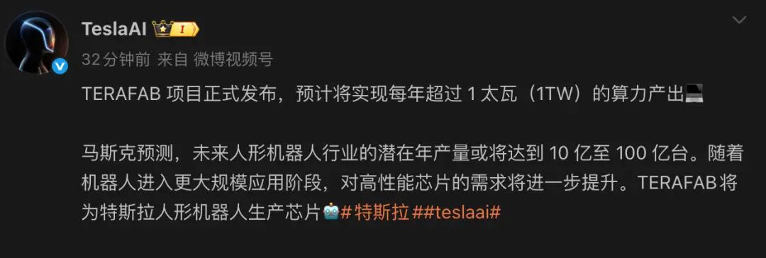 3月30日,TeslaAI官方微博发布消息称,正式启动TERAFAB超级芯片工厂项目,预计将实现每年超过1太瓦(1TW)的算力产出,这相当于当前全球AI芯片年总算力产出的约50倍。马斯克表示,这将是迄今为止历史上最宏大的芯片制造项目。
