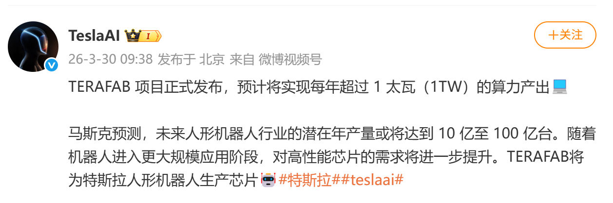 3月30日,TeslaAI官方宣布正式启动TERAFAB超级芯片工厂项目,总投资预计200亿美元,规划年产能1000亿至2000亿颗先进AI及存储芯片,目标年总算力超1太瓦,相当于当前全球AI芯片年总算力的约50倍。