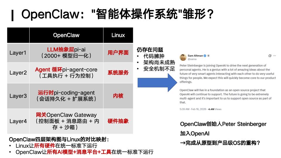 我最近也经常跟人讨论,整个 OpenClaw 的代码其实缺乏一个非常强的团队去维护,随着大家大量用 AI 生成代码去修改维护它,它现在的状态像早期的 Linux 非常粗糙的状态一样,目前整个代码非常臃肿,甚至已经是一个人不可 review 的状态,整个架构也没有成熟。我觉得这也是它的创始人加入 OpenAI 的意图之一,他希望借助大公司的力量完成目前的原型和产品级 OS 的重构。