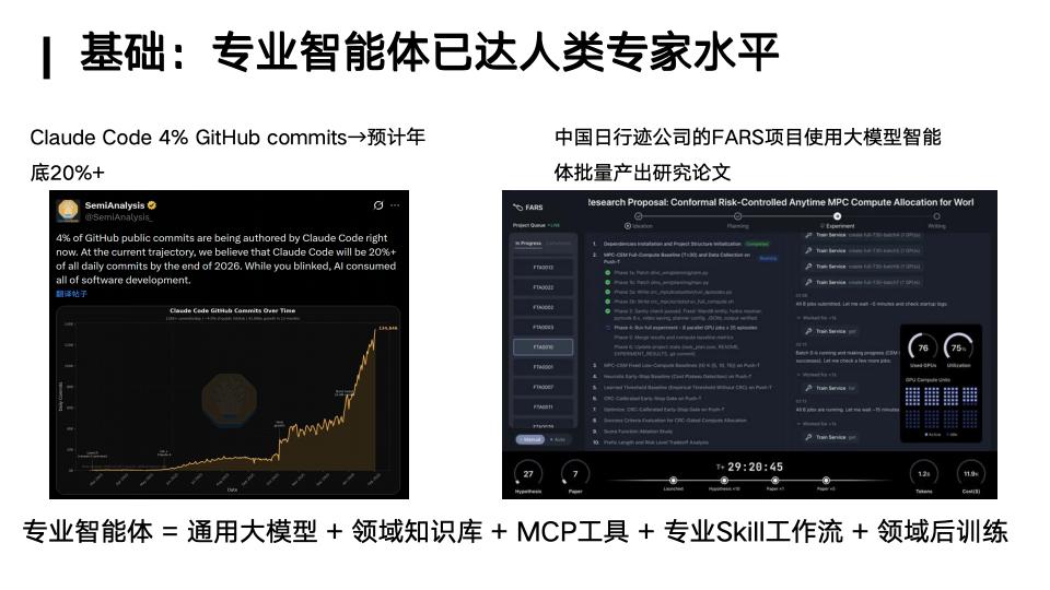 同时,我们专业智能体的能力也已经达到了人类专家的水平,正如刚才说的一样,Agent 在垂域的突破非常多,代码领域非常成熟。比如代码领域的 Claude Code,再 GIthub 上的 commit 占比达到了 4%,预计年底将贡献 GitHub 上 20% 的 commits ;国内日行迹公司的 FARS 项目也已经证明大模型能批量产出研究论文。
