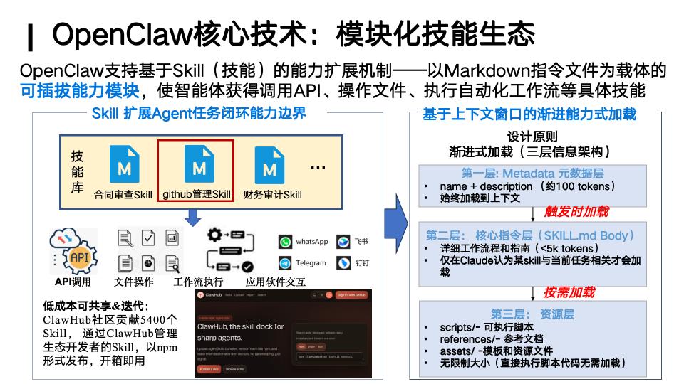 OpenClaw 的总体技术架构非常简单清晰,从底层的系统控制到 Agent 循环系统,再到上层的标准化封装和信息流管理,最后接入暴露给用户的各种 channels。为什么大家用起来这么好呢?本身就是它的六大关键技术特征 —— 这个不是我提的,是我在另外一场报告里面听人讲的,总结的非常好:社交接入、本地部署、设备接入、模型生态、技能生态,这些特征使得它对底层模型、各类用户、各种设备以及复杂任务都具备了极强的兼容性 。