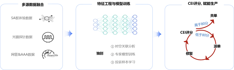 从客户视角出发,由外向内精准查摆体验问题,北京移动创新引入AI驱动的CEI量化评估与定界定位体系。该体系基于华为SA智能单板的体验感知数据,以及光猫软探针、网管和AAA等多元数据,通过独创的时空关联分析算法及投诉样本学习训练,完成特征工程与AI模型训练,全面提升家宽用户上网卡、慢、断的精准感知能力,达到业界领先水平。