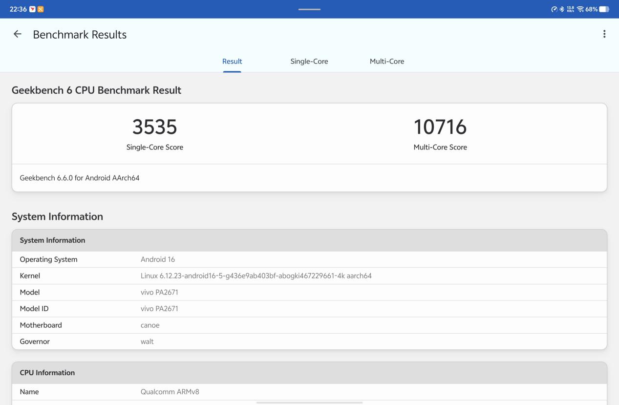 使用 GeekBench 6 测得单核成绩为 3535 分,多核成绩为 10716 分。