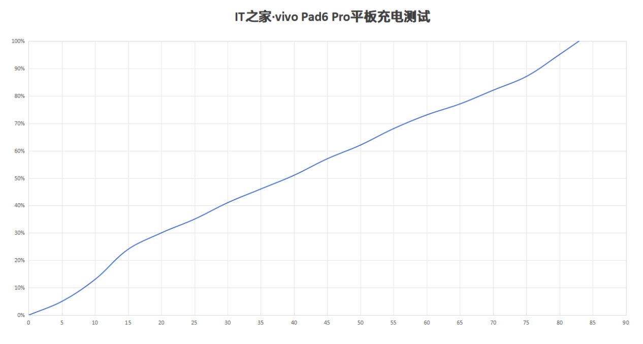 至于充电速度方面,在 90W 闪充的加持下,vivo Pad6 Pro 从电量为 0 充满到 100%,用了 83 分钟,对于 13000mAh 的电池容量来说还是能让人满意的。