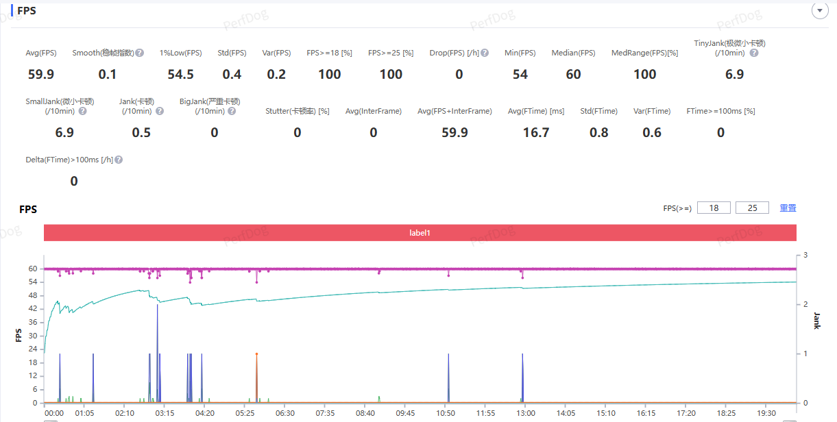 然后我们使用性能要求更高一些的《原神》进行测试,测试时画质选项都调到最高,然后在游戏中的枫丹廷进行 20 分钟的跑图。全程测试下来也是轻松应对,平均帧率达到 59.9 FPS,帧率曲线也基本是一条直线,实际游戏体验感受也是感觉不到帧数的波动。