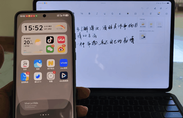 再比如当你在原子笔记中编辑文档的时候,需要插入照片,如果照片在手机上,你可以在原子笔记上直接连接到你的 vivo 手机,将手机上的照片直接贴入到笔记中,或者是调起手机的摄像头进行拍照,拍完照后点击确认,照片也能直接贴入到笔记中。