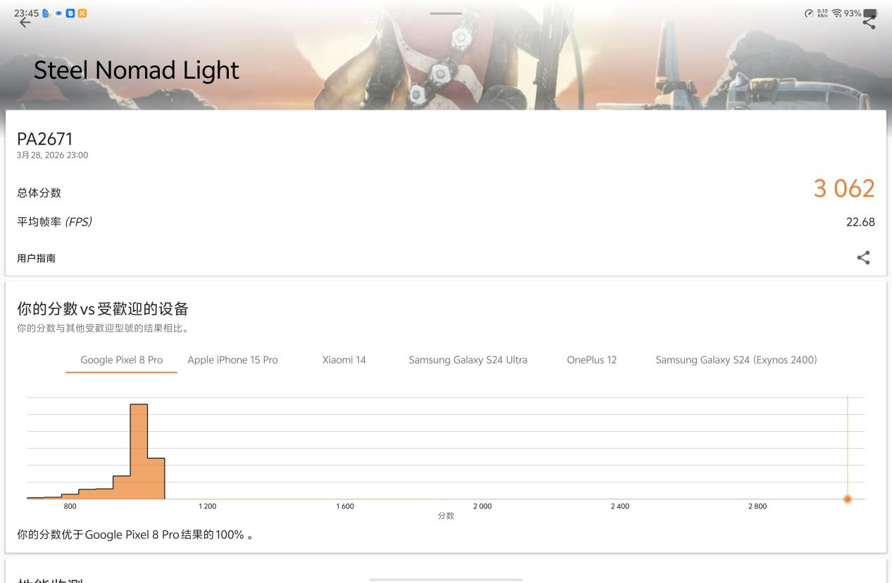 在 GPU 性能方面,IT之家还使用《3D Mark》测试了 Steel Nomad Light 项目,得到综合分数为 3062 分,平均帧率为 22.68 FPS。
