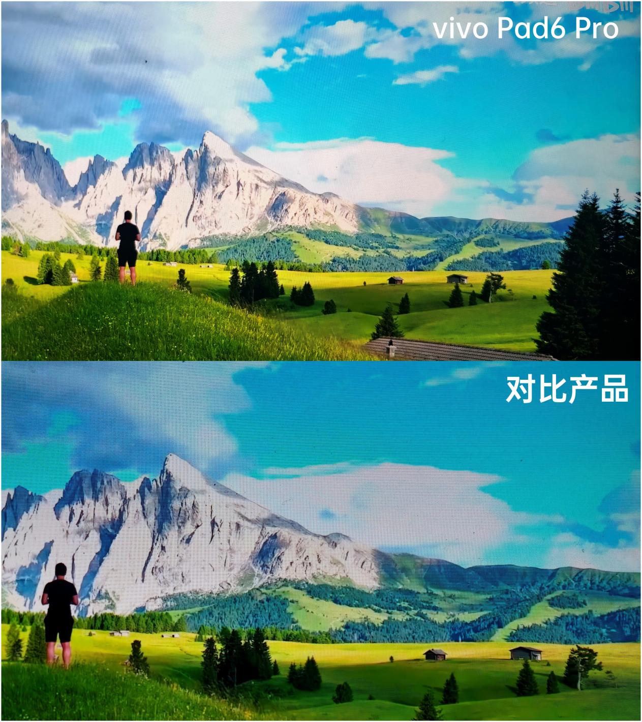实际测试时,IT之家使用 vivo Pad6 Pro 播放 4K 分辨率的 HDR 片源,并将其和另一款 1080P 分辨率(播放时片源也是 4K 清晰度)的 vivo 平板进行对比。以下面这一帧的画面来说,可以看到,右侧 vivo Pad6 Pro 呈现的画面明显比左侧对比产品更加细腻,同时 vivo Pad6 Pro 支持 HDR10 的画面显示,可以明显看到,在远处天空高光的部分,vivo Pad6 Pro 显示的天空细节层次明显比对比产品更加丰富,对比产品的远处天空高光有些亮成一片了。