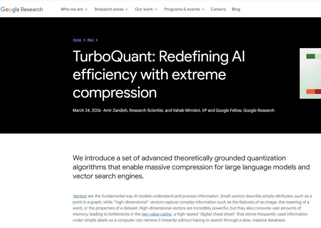 3月26日,谷歌研究院(Google Research)的一篇论文震动全球存储芯片市场,引发美国和韩国巨头超900亿美元市值蒸发。