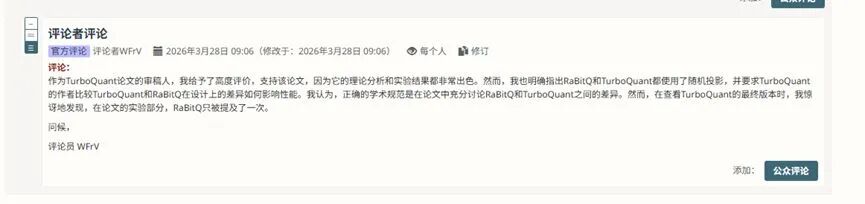 这一点在本案例中尤为重要,因为ICLR的一位审稿人也在审稿意见中独立指出“RaBitQ及其变体与TurboQuant的相似之处在于,它们都使用了随机投影”,并明确要求更充分的讨论和比较。