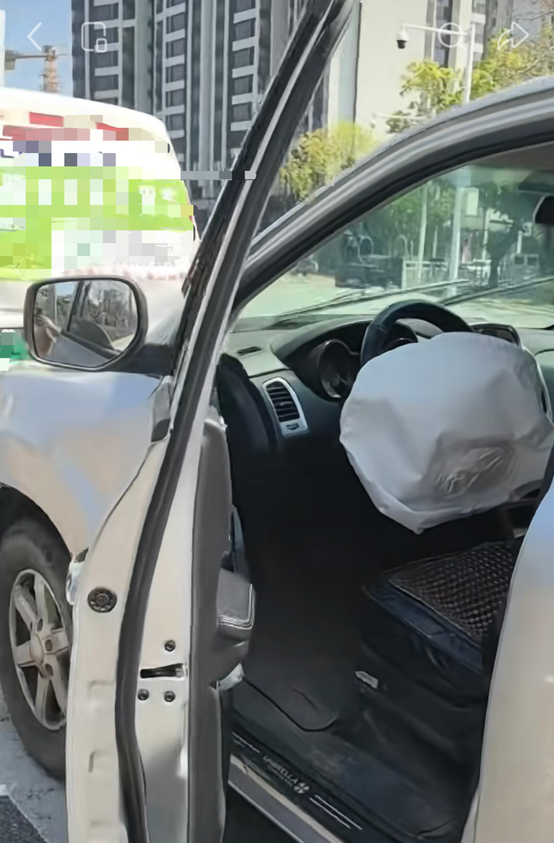 而位于中间“腹背受敌”的白色货车,前脸格栅和引擎盖区域明显变形、翘起,前保险杠右侧破损下垂。车尾亦产生严重变形、凹陷。