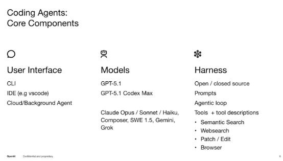 今年年初,OpenAI 的架构师 Bill Chen 和 Brian Fioca 在一期演讲里详细介绍了 Codex 构建过程中克服的挑战,以及 Coding Agent 本身一些新兴的使用模式。谈及 Coding Agent 的构成时介绍其由三部分组成:用户界面、模型和 Harness。