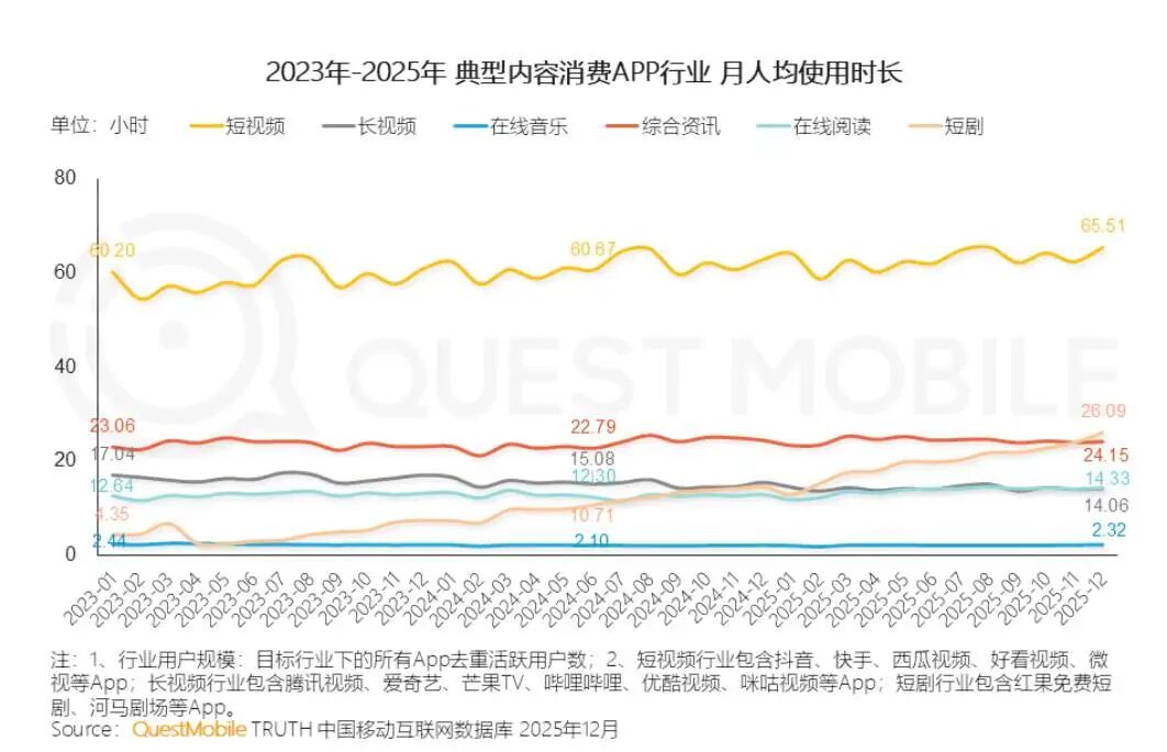 数据显示,2025年长视频的全网用户月均时长为14.06小时,和23年相比下滑了17.5%;而短剧则从4.35小时攀升至26.09小时。而短视频则仍以月均65.51小时的时长,持续高位领先。