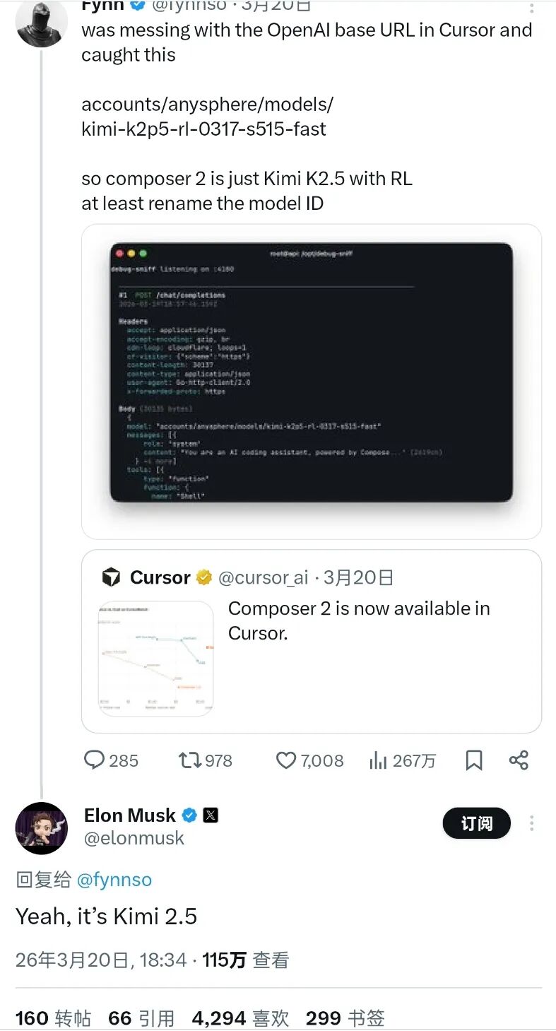 更搞笑的是3月底,估值500亿美刀、全球最高的AI编程工具Cursor,被网民发现其大吹特吹的下一代产品,核心模型竟然是“套壳”中国的Kimi。连马斯克都绷不住了,下场实锤说是的,这特么就是Kimi2.5。