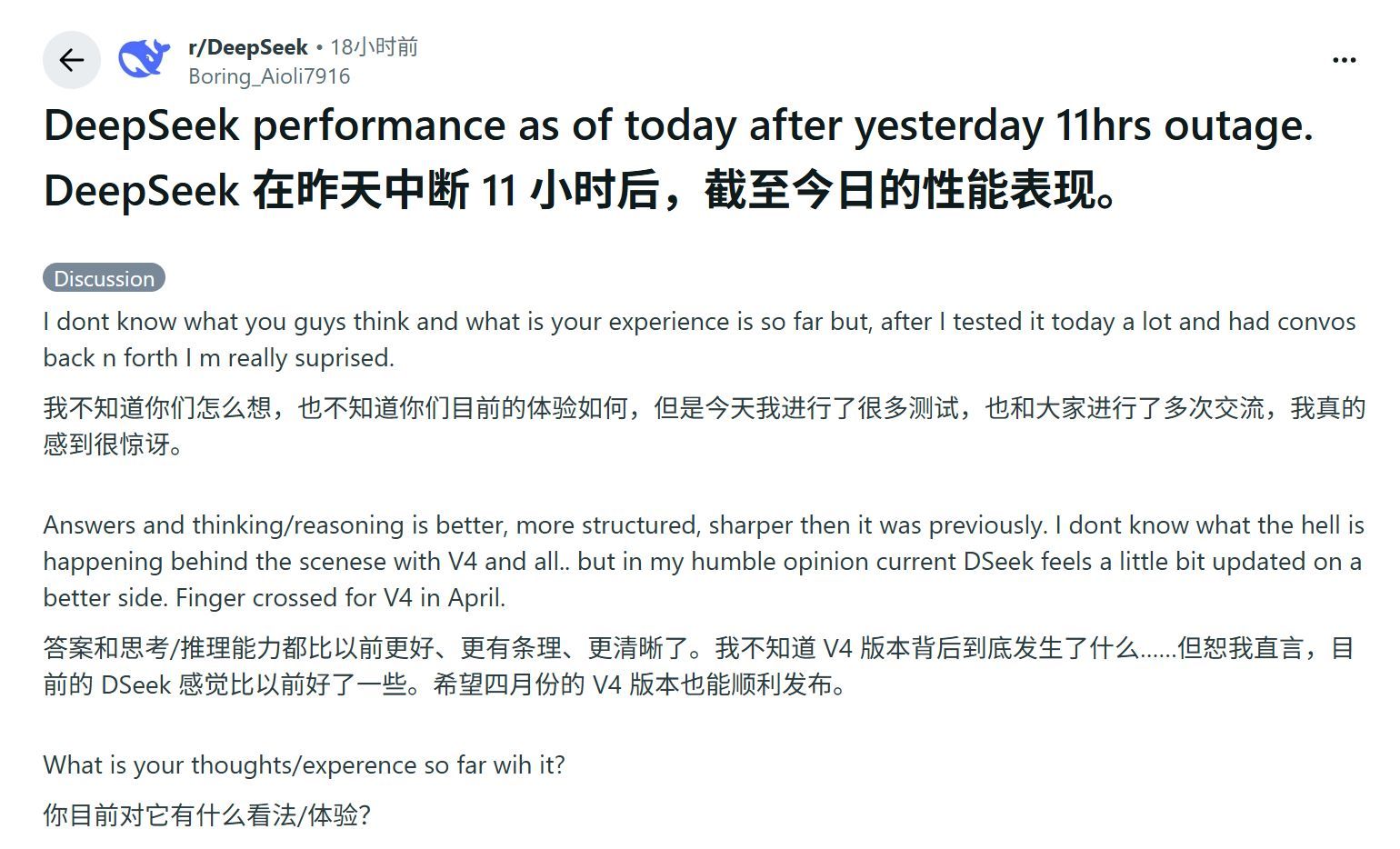 而在社交媒体上,多名资深开发者认为3月31日恢复后的DeepSeek,其输出逻辑、编码风格出现了很大的变化。