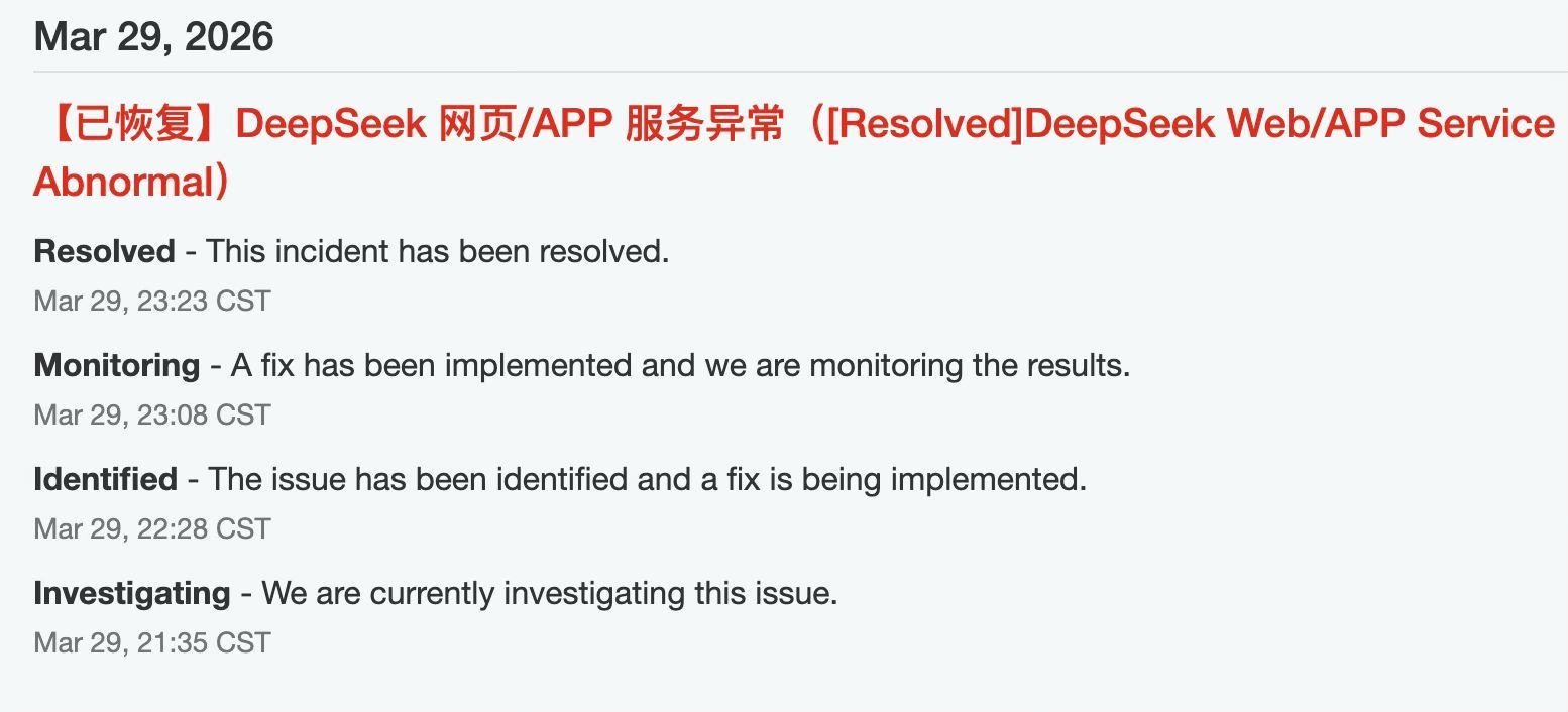 DeepSeek服务状态页面显示3月29日故障情况