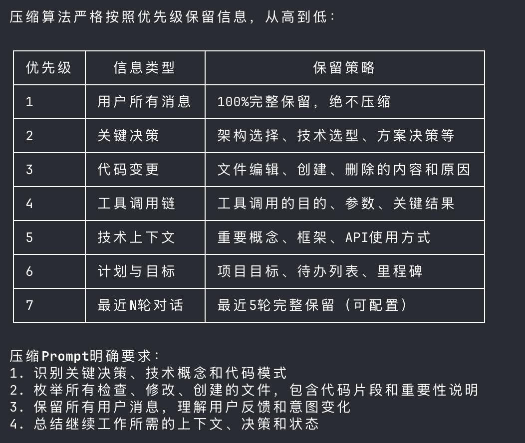 当对话token超过阈值时,自动启动上下文压缩,智能保留最关键的逻辑链条。