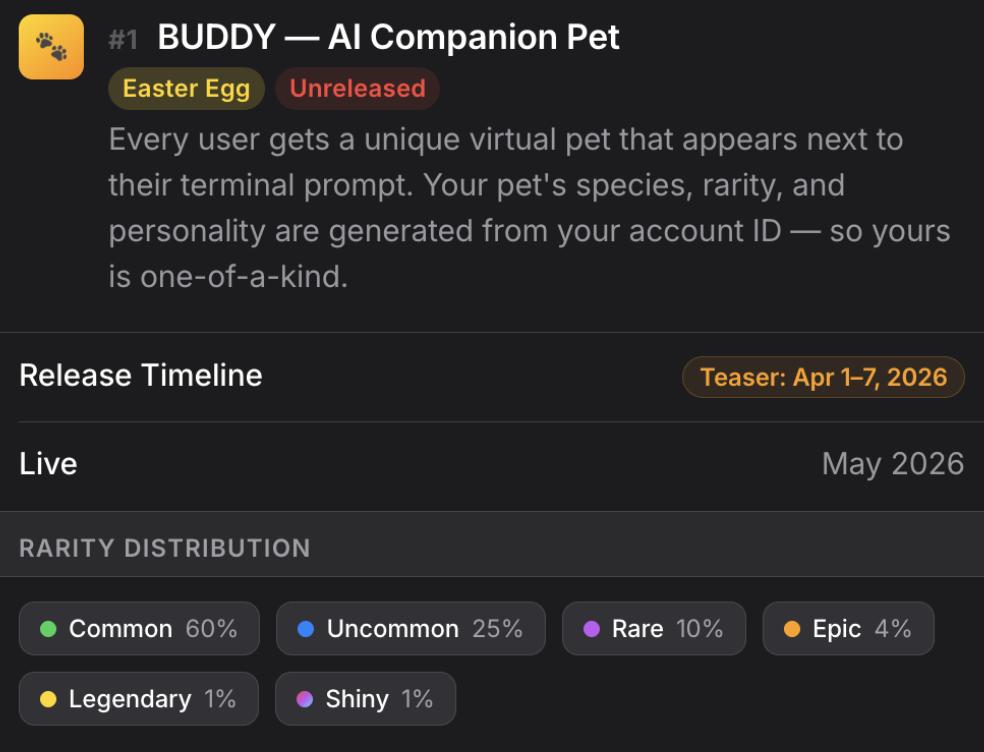 代号Buddy。一个Tamagotchi风格的ASCII虚拟宠物,会出现在你的终端。