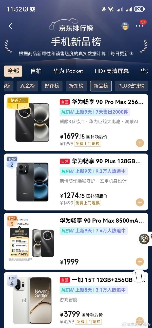 【CNMO科技消息】近日,博主“京城数码爷”截图的京东手机新品榜数据显示,截至2026年3月31日23时,华为畅享系列成功包揽新品榜单前三名。其中,华为畅享90 Pro Max(256GB版本)位居榜首,华为畅享90 Plus与华为畅享90 Pro Max(无国补)紧随其后。