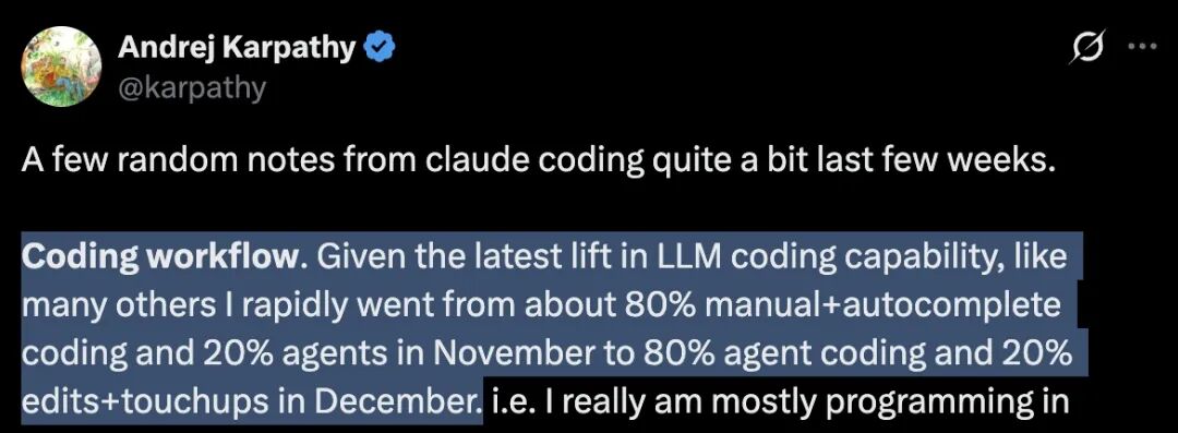 用Karpathy的话说:我现在基本上是在用英语编程,虽然有时多少会觉得有点伤自尊,但那感觉还是太值了。