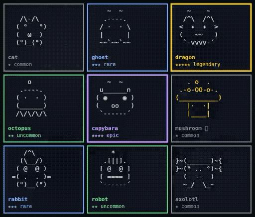 Claude 一共设计了鸭子、鹅、猫、章鱼、猫头鹰、企鹅、乌龟、蜗牛等 18 个电子宠物,就像抽卡一样,不同的宠物有不同的等级,例如我们抽到的是两颗星的 uncommon,还有 common、rare 稀有等不同品类。