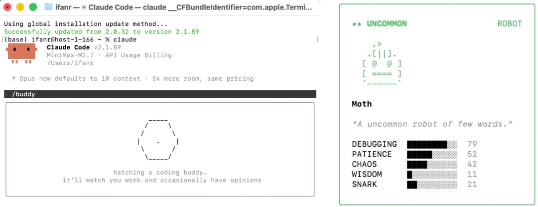 输入 claude update,更新本地的 Claude Code 之后,再进入 Claude Code,输入 /buddy,我们就能随机得到一个小宠物。