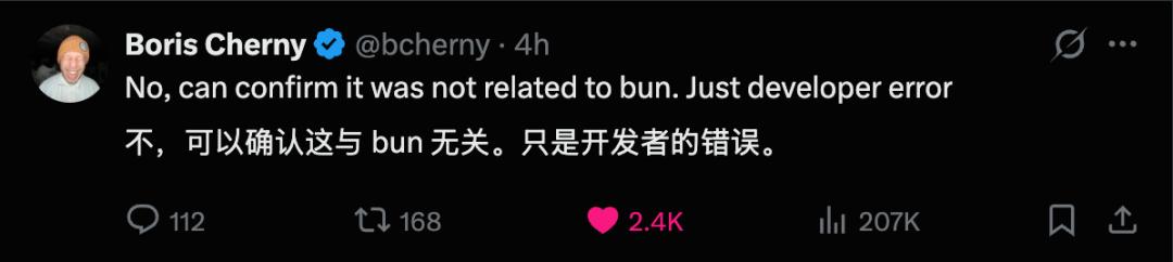 Claude Code 的负责人在 X 上回应:「这不是 Bun 相关的安全漏洞,没有用户数据泄漏,只是开发者的错误而已。」
