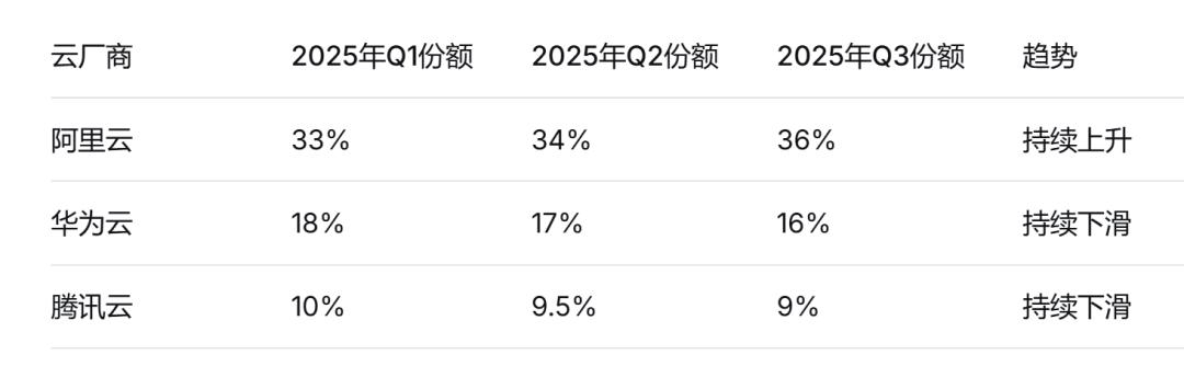 根据Omdia的追踪数据,2025年前三季度,中国公有云市场的座次是这样的 :