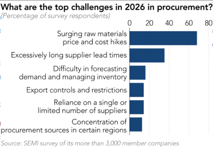 全球半导体行业协会SEMI开展的调查显示,近70%的会员企业将原材料价格上涨导致的采购成本攀升列为今年首要挑战,超35%的企业表示,材料与供应的交期延长也构成重大担忧。