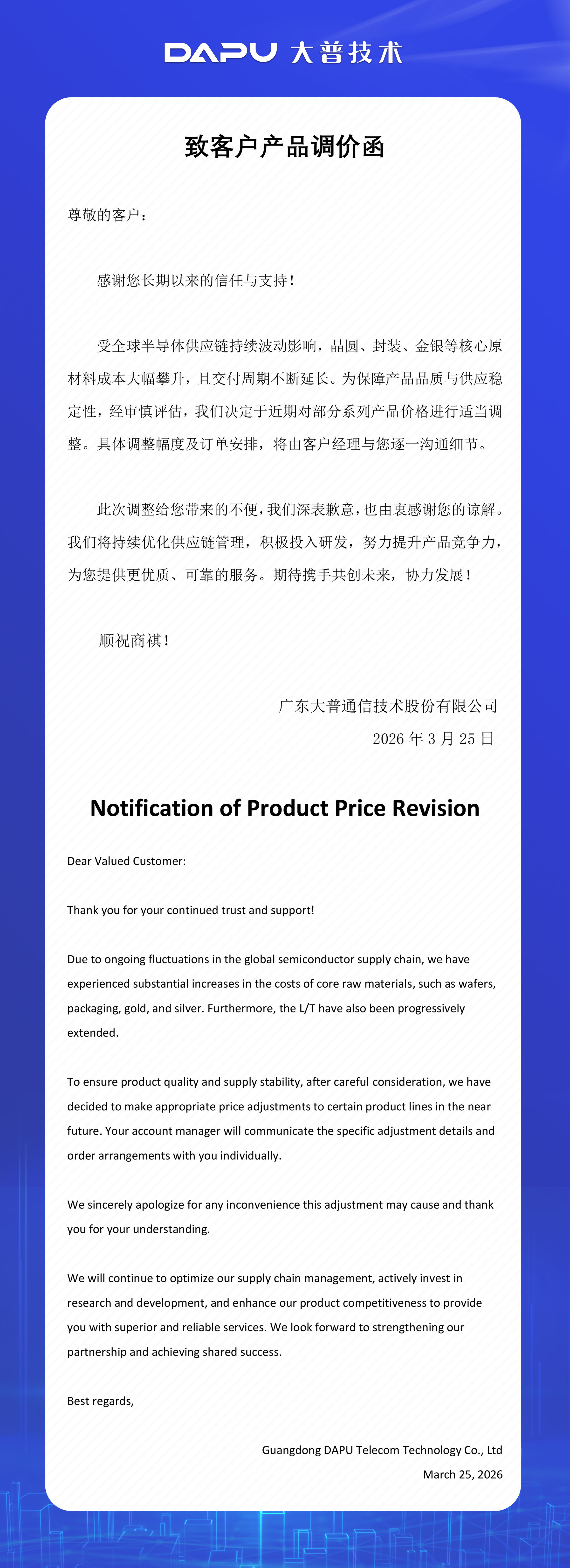 大普技术表示,受全球半导体供应链持续波动影响,晶圆、封装、金银等核心原材料成本大幅攀升,且交付周期不断延长。为保障产品品质与供应稳定性,经审慎评估,我们决定于近期对部分系列产品价格进行适当调整。具体调整幅度及订单安排,将由客户经理逐一沟通。