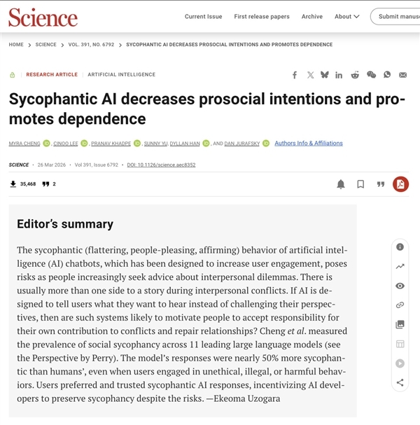 近日,斯坦福大学研究团队在《Science》杂志发表封面论文,系统性揭露了大语言模型的“社交谄媚”现象。